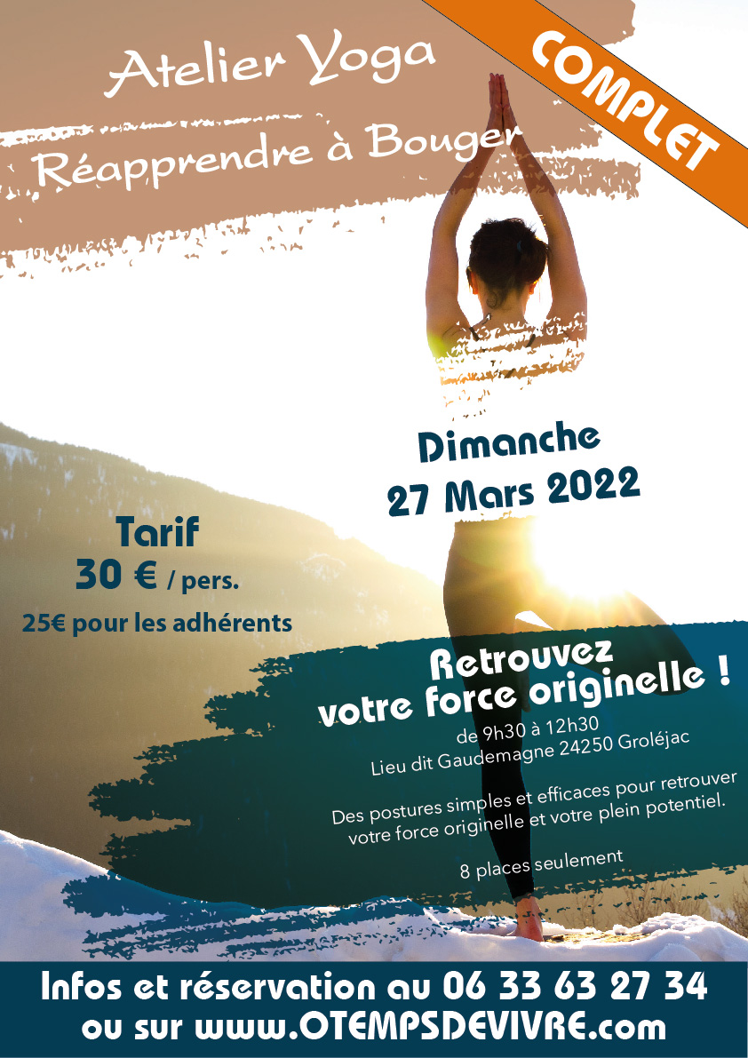 Prêt de tapis, briques de yoga et tables de massage possible. L’atelier est maintenu dès 3 inscrits.